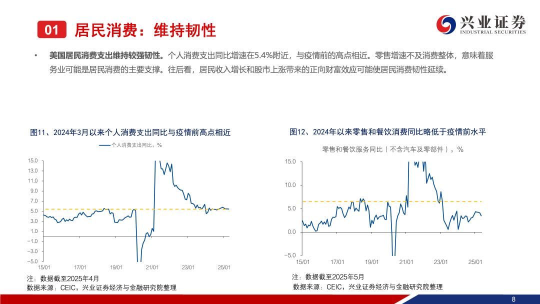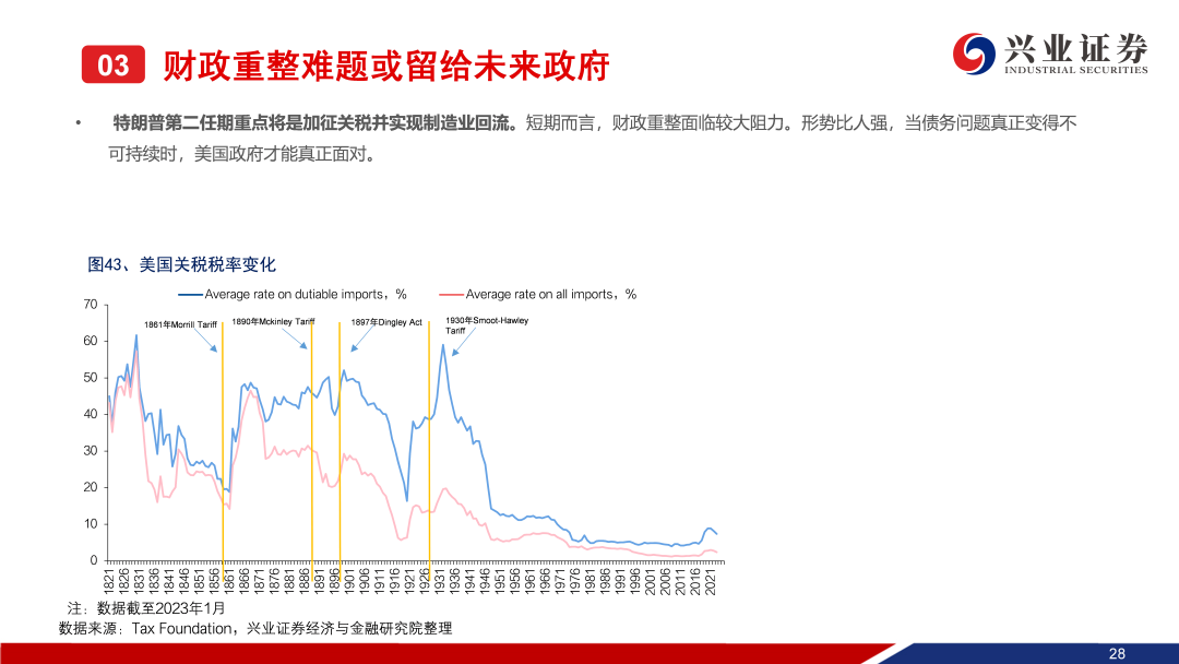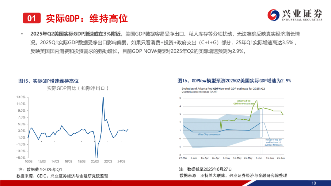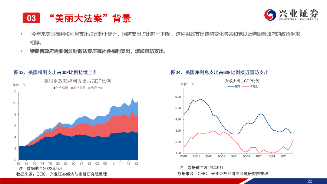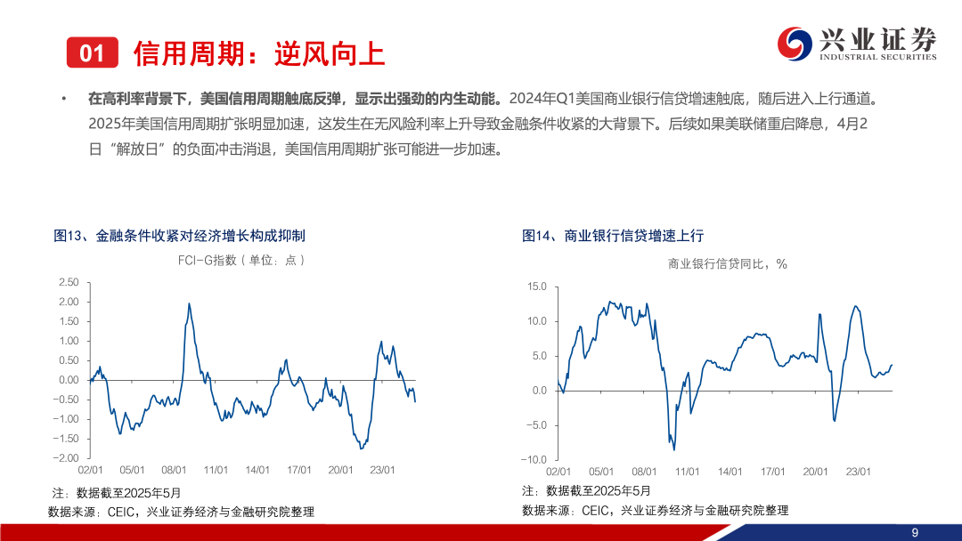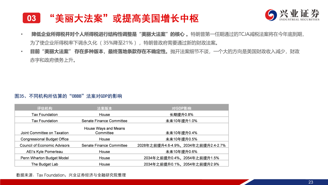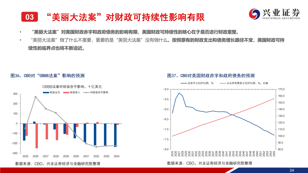 3、“美丽大法案”对美国财政赤字和政府债务的影响有限,美国财政可持续性的核心在于是否进行财政重整。美国金融体系和私人部门杠杆稳健,出现系统性风险概率偏低,财政可持续性属于中长期风险。