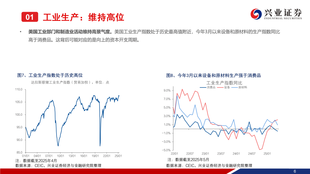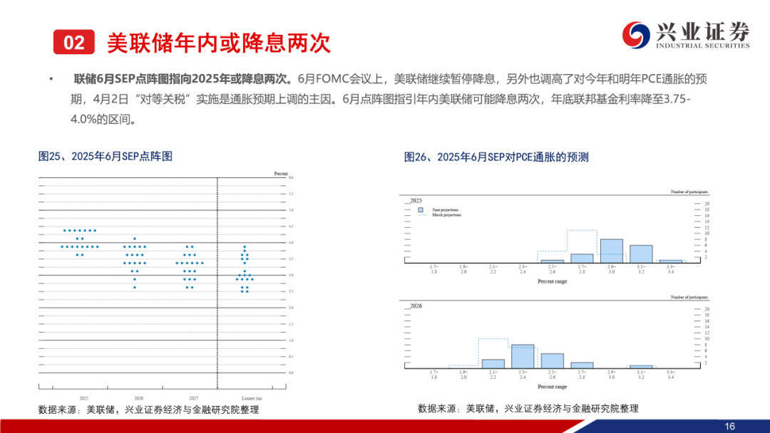 4、当前美债曲线处于数年来最陡峭的状态,短端利率已基本完成对降息预期的定价,长端下行空间主要来自期限利差的压缩。三季度10Y UST下至4.0-4.1%可考虑止盈。后续随着美国基本面动能回升,美债曲线或重新上移。美元指数不完全是对美元资产信心危机的定价。美元原本就处于周期偏高位置,随着美联储降息预期升温,弱势美元或延续。